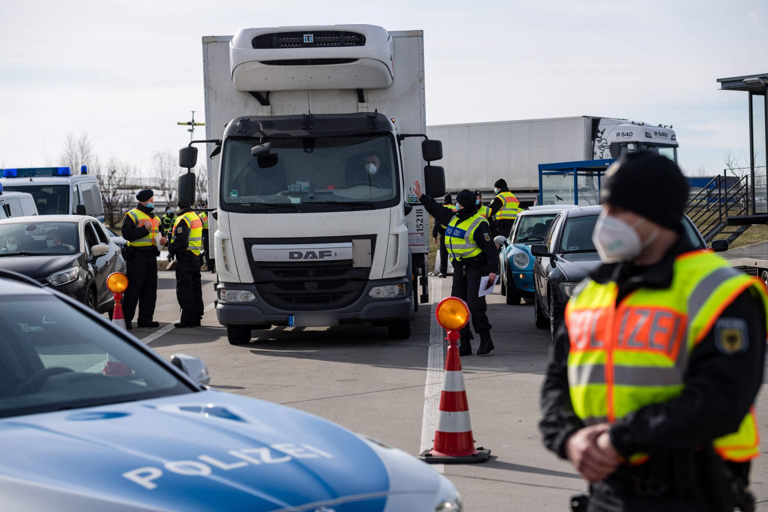 German officers control a truck and several cars at the border with the Czech Republic in Breitenau, as Germany tries to stem the spread of coronavirus variants.