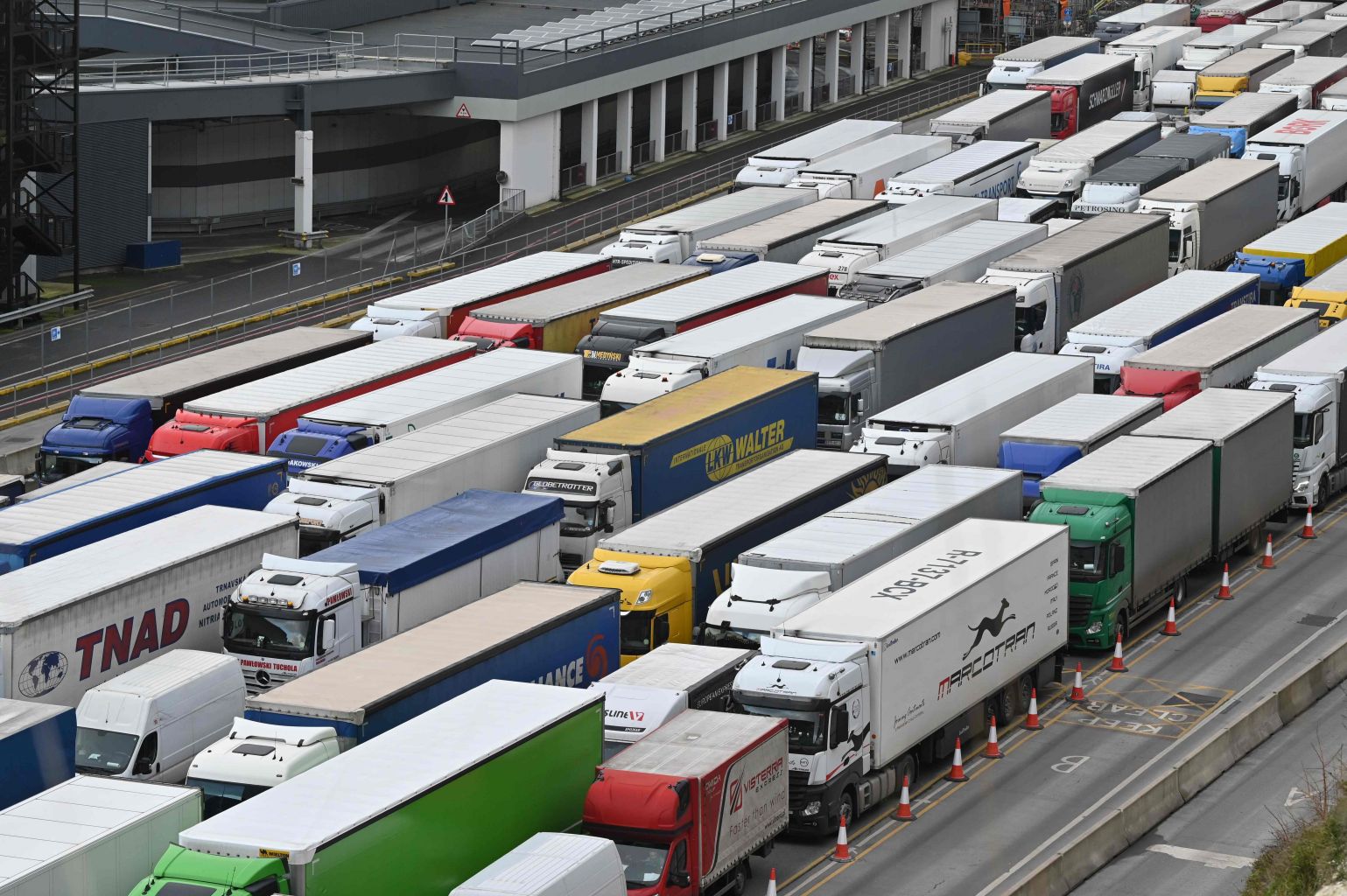 Freight lorries are seen queuing as they enter the port of Dover on the south coast of England on Dec 10, 2020.