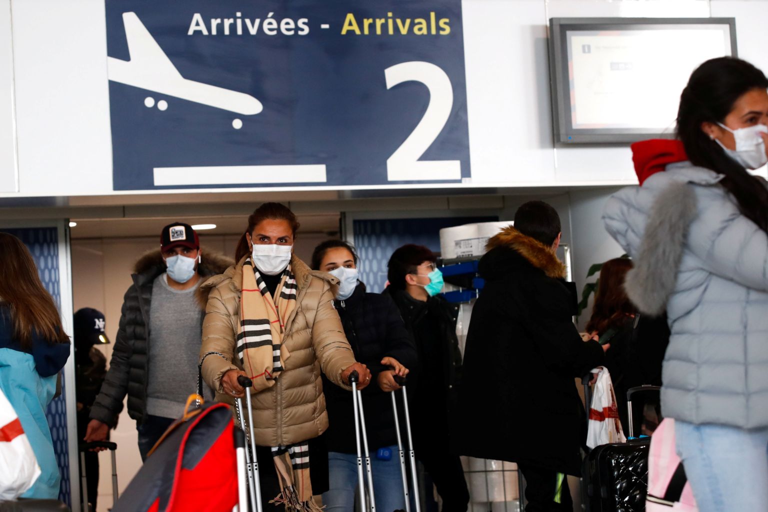 In a photo taken on Feb 29, 2020, people wearing protective face masks arrive at Charles de Gaulle airport in Paris, France.