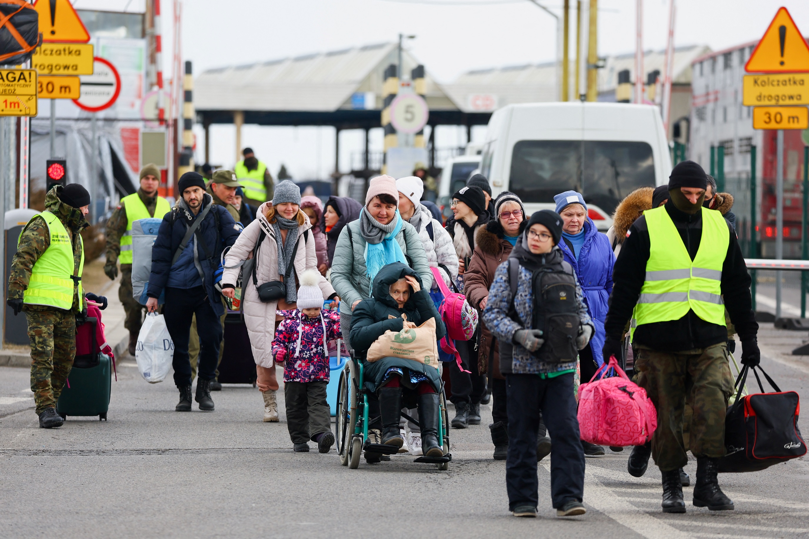 People cross the border from Ukraine to Poland, after fleeing Russia's invasion of Ukraine, on March 10, 2022.
