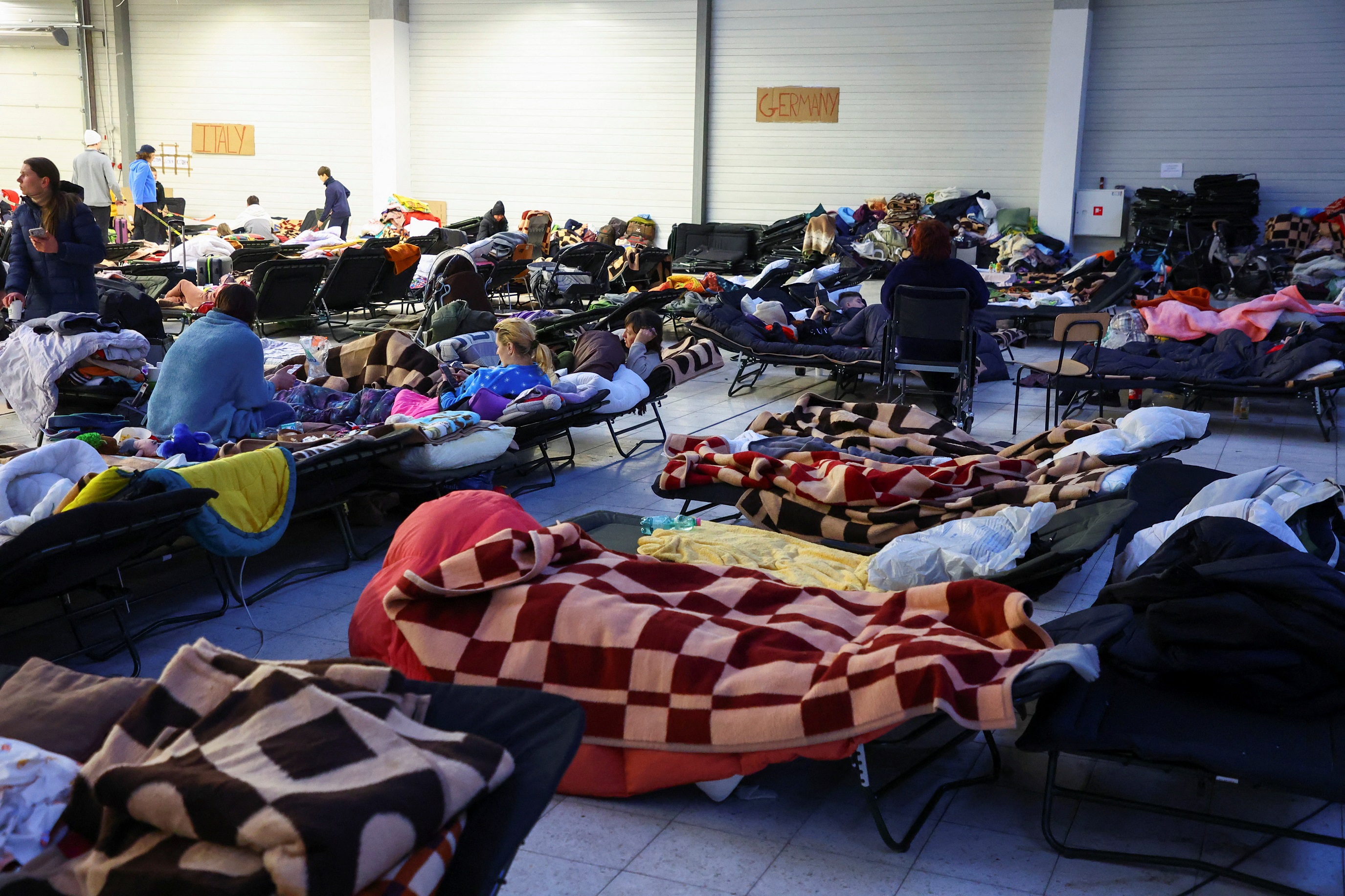 People fleeing Russia's invasion of Ukraine rest at a temporary accommodation centre, in Korczowa, Poland.