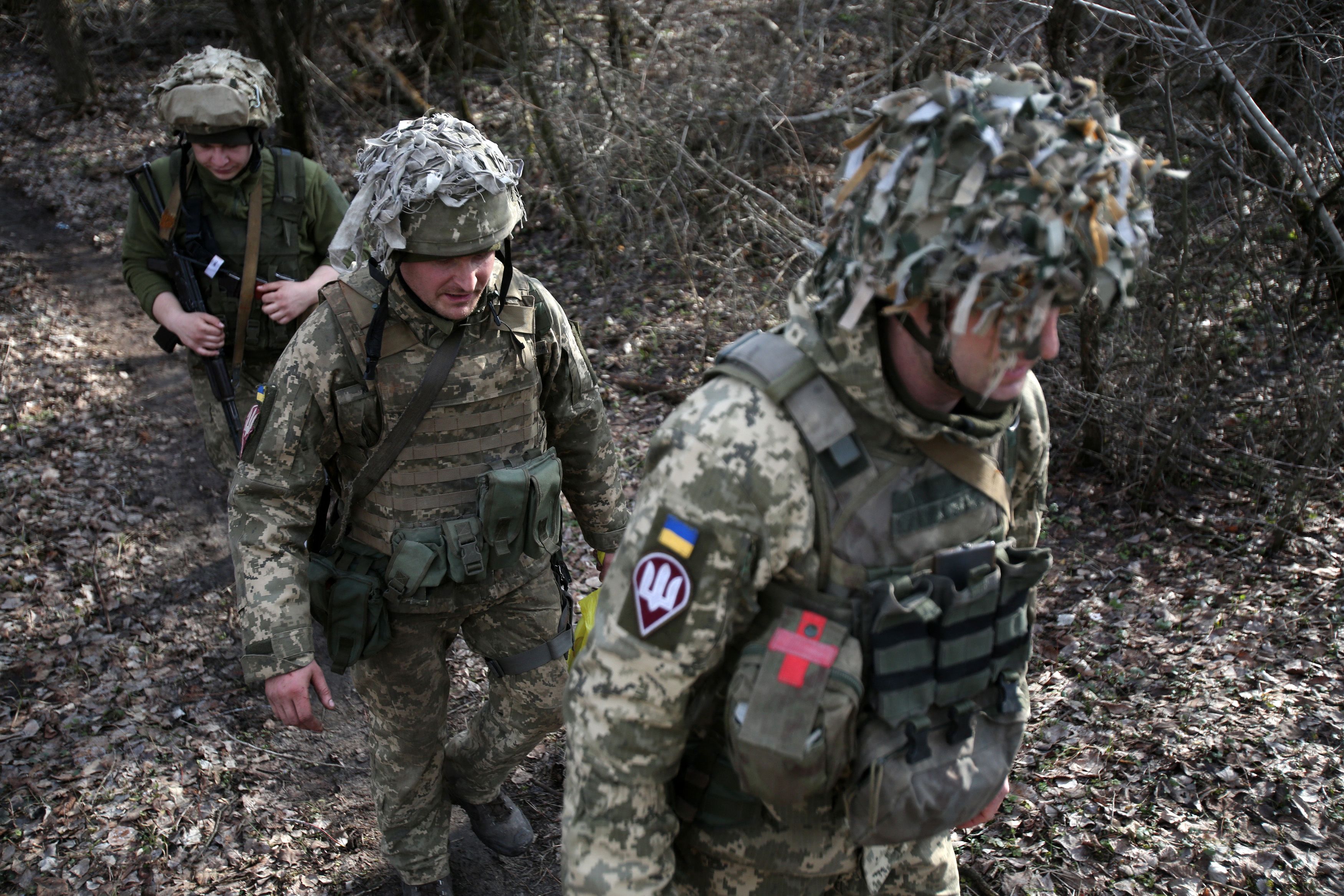 Ukrainian servicemen are seen on the front line with Russia-backed separatists, near the eastern Ukraine city of Lugansk, on Feb 23, 2022.