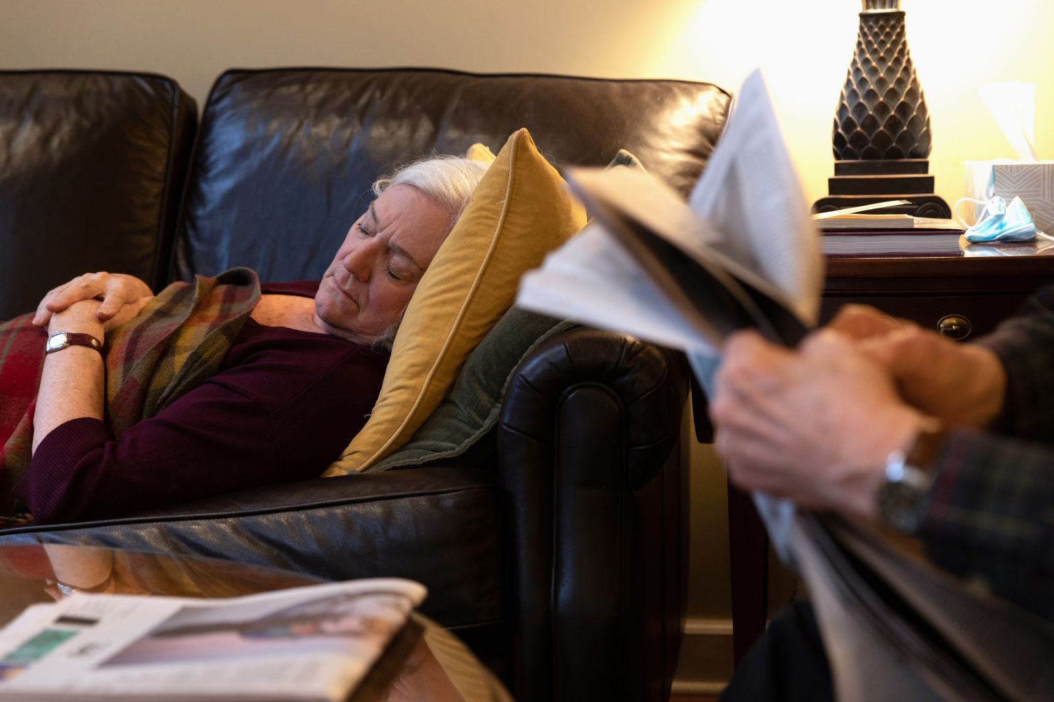 US long-Covid patient Penny Parkin, 69, takes a nap while her husband John reads the newspaper.