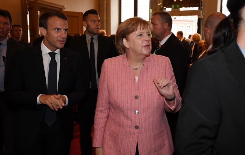 German Chancellor Angela Merkel and French President Emmanuel Macron arrive for the Charlemagne prize award ceremony in Aachen, Germany. on May 10, 2018.