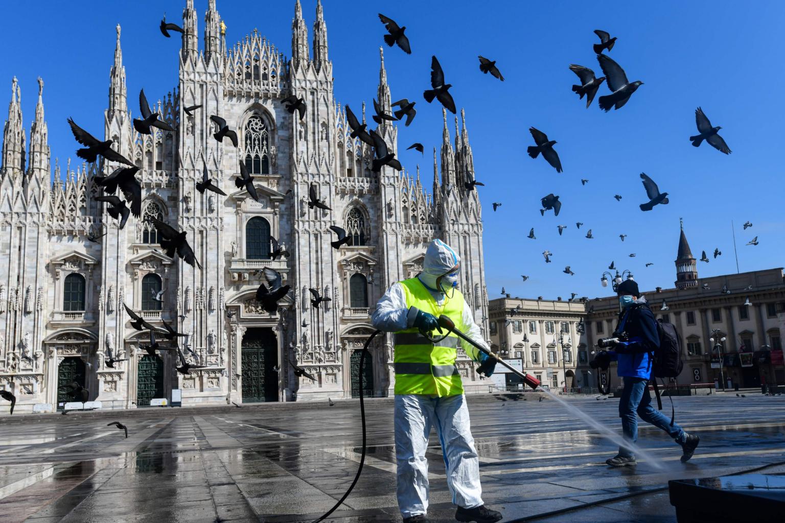 A worker sprays disinfectant in Piazza Duomo in Milan, on March 31, 2020.