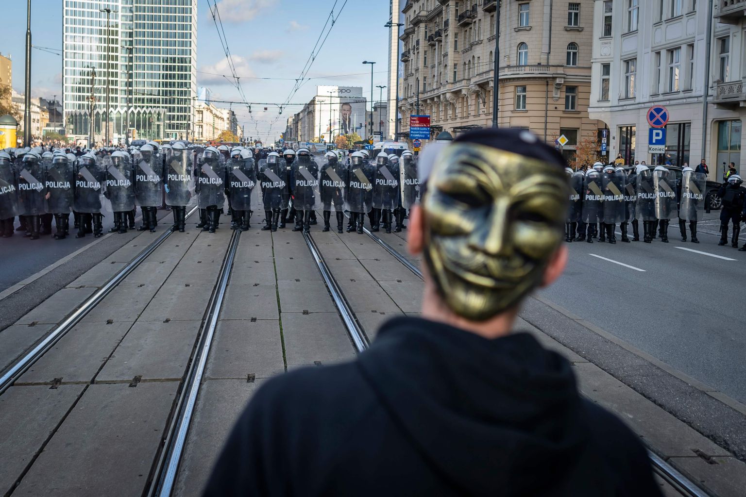 Police clash with participants of a demonstration against coronavirus restrictions on Oct 24, 2020 in Warsaw, Poland.
