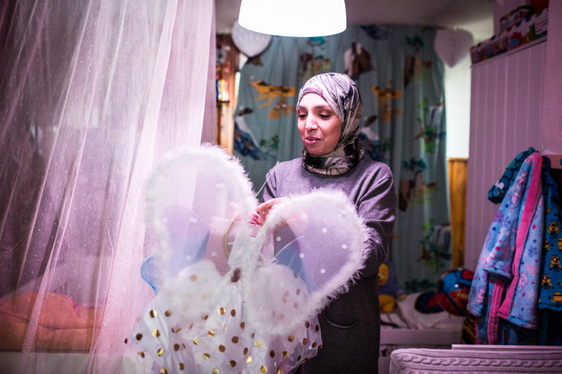 Fatiha, a Belgian whose grandparents emigrated from Morocco, looks at a dress that she bought for a granddaughter at her home in Ranst, Belgium.