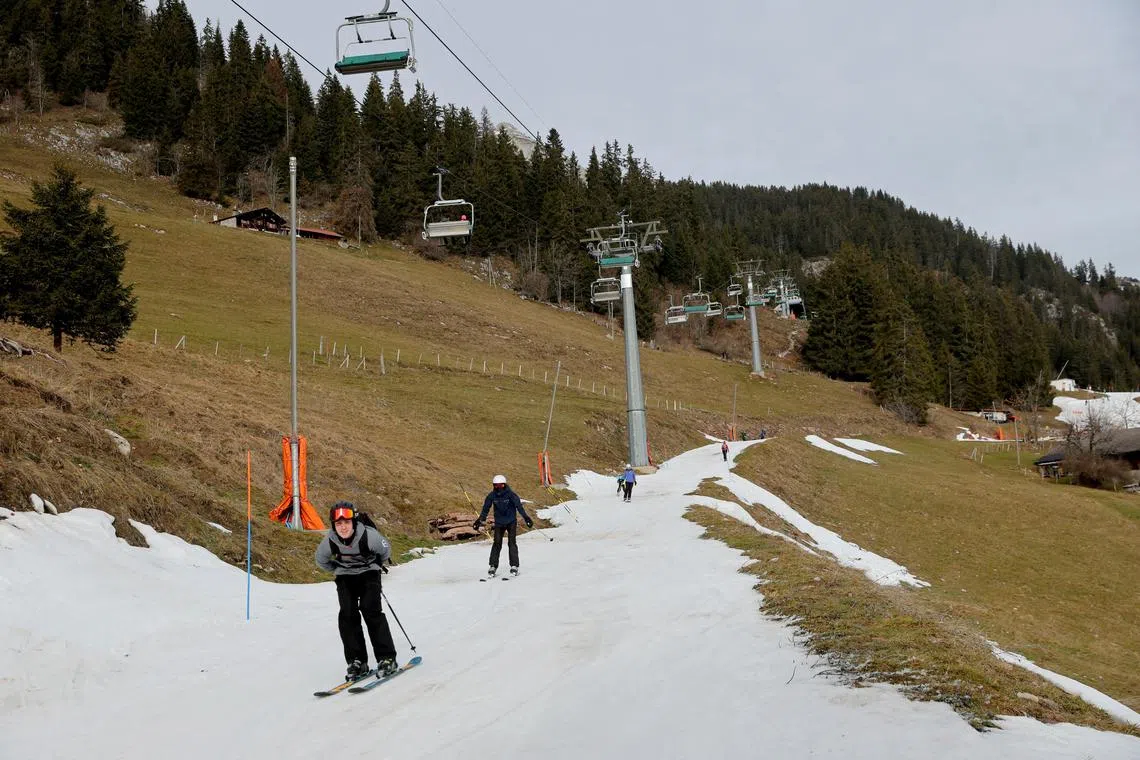 Skiers take advantage of a small layer of artificial snow, amid warmer-than-usual winter temperatures in the Alps, in Leysin, Switzerland, on Jan 4, 2023.