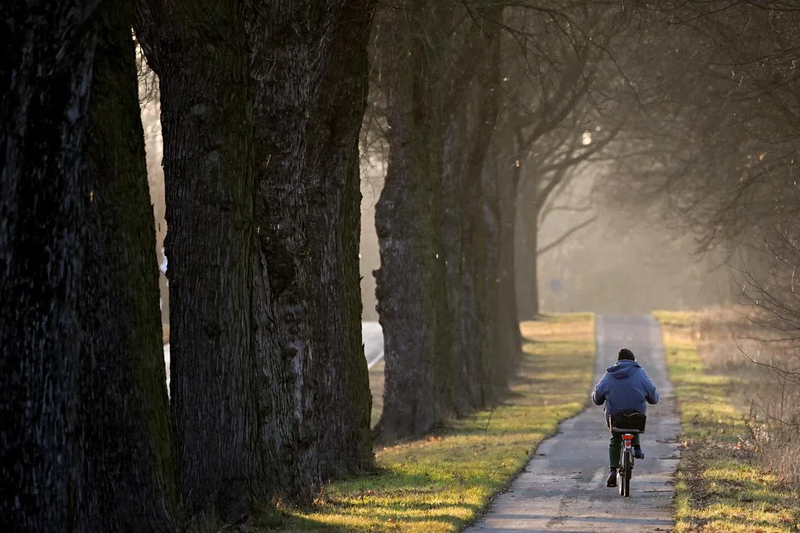 An elderly woman rides her bicycle during a sunny afternoon near Mittenwalde, Germany, on Jan 3, 2022.