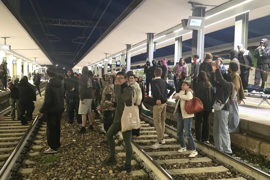 Pro-Palestinian protesters blocking railway tracks in Brescia, Italy, on Oct 2.