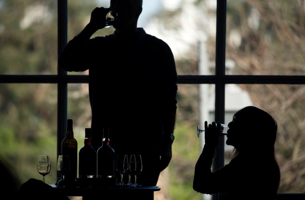 A group of people samples wine at Graham’s Port Lodge in Porto, Portugal.
