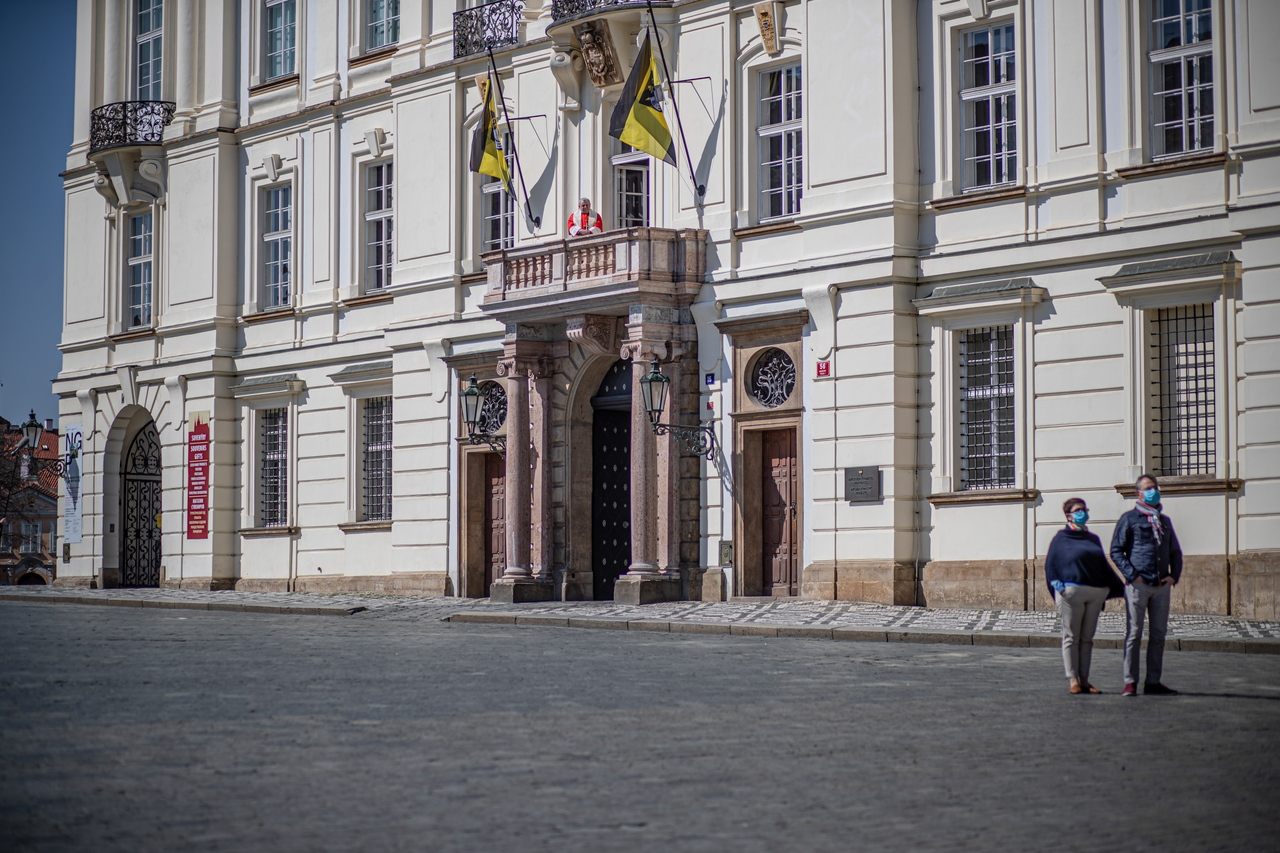 Archbishop of Prague Cardinal Dominik Duka (centre) stands during performance of the Castle Guard Band on April 5, 2020.