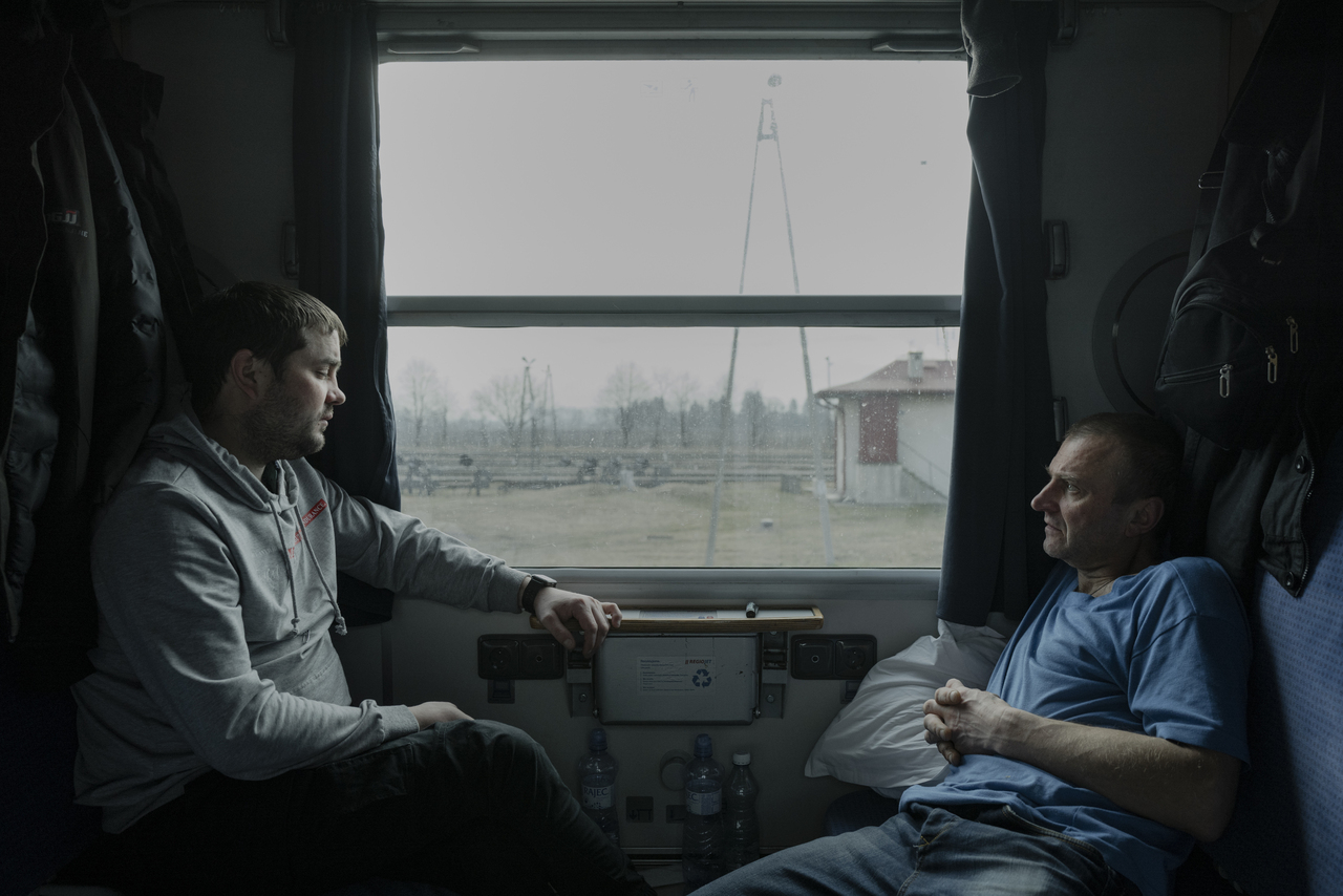 <p>Ukrainians Volodymyr Kotsyuba, left, and Vitali Slobodianiuk, both traveling back to their country to join the fighting, on a train from Prague to Przemysl, Poland, March 8, 2022. EuropeÕs railways, built up over 150 years of conflicts, have played a central role in the continentÕs peacetime integration. Now theyÕre back on a war footing. (Emile Ducke/The New York Times)</p>