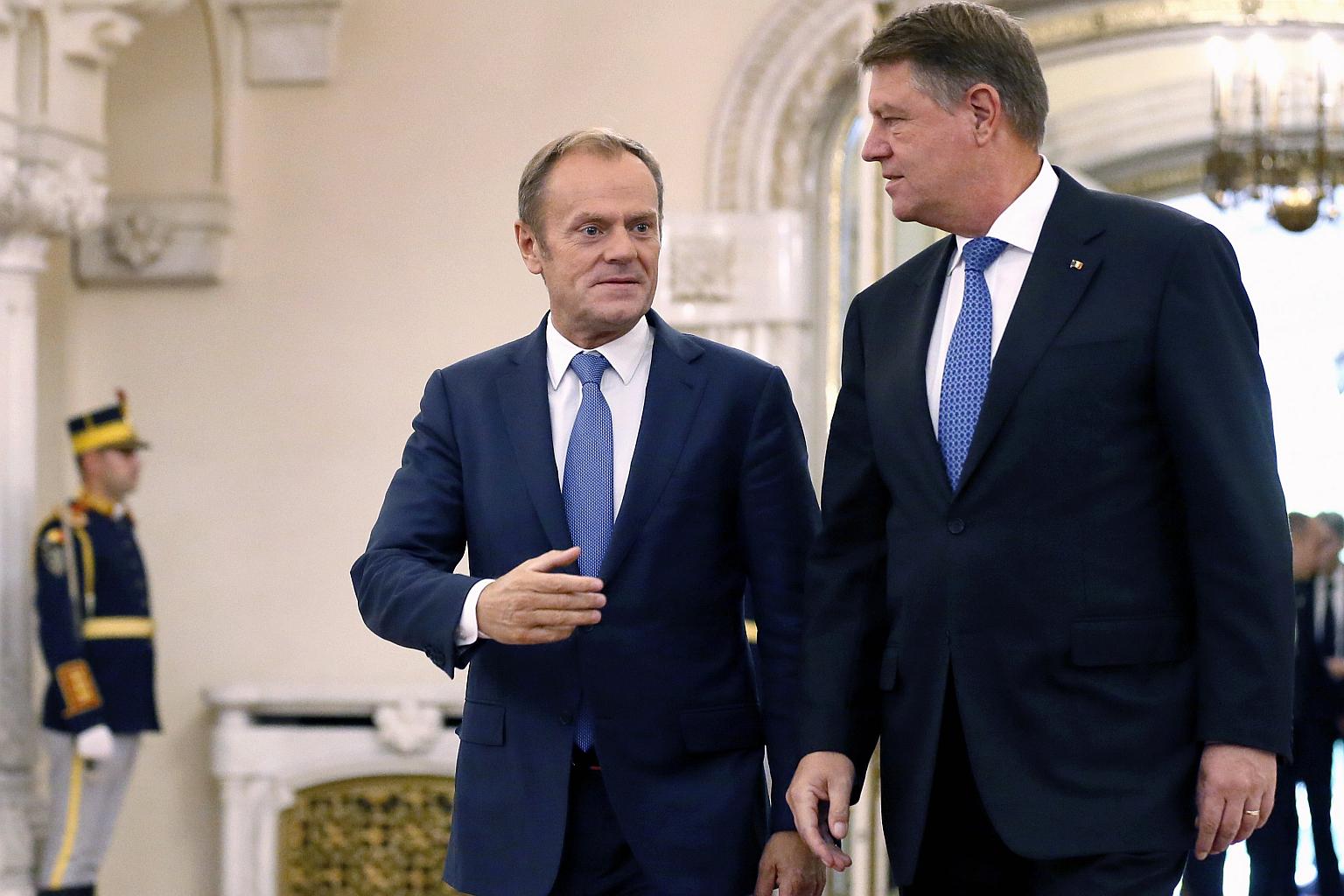 European Council President Donald Tusk (left) meeting Romanian President Klaus Iohannis. Mr Tusk stressed that the talks could take place among the current 28 members, including Britain, or just the 27 remaining countries "depending on the subject".