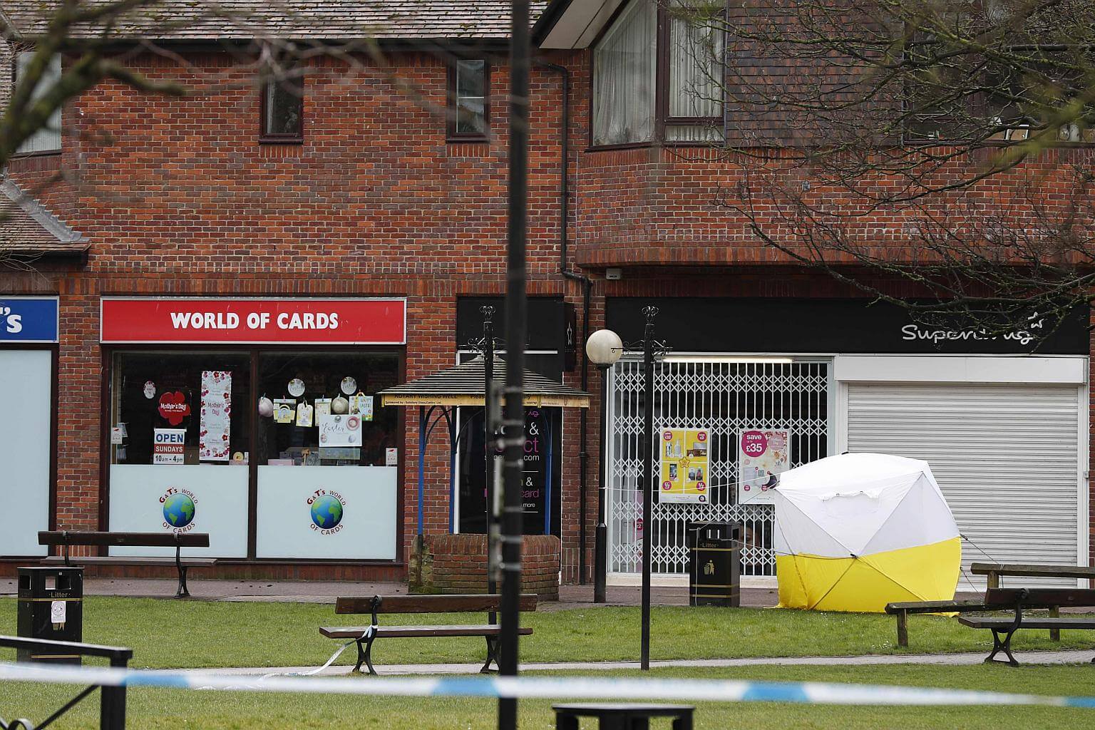 The bench, where a man and woman were found poisoned by a nerve agent, covered in a protective tent in The Maltings shopping centre in Salibury, England, on March 9, 2018.