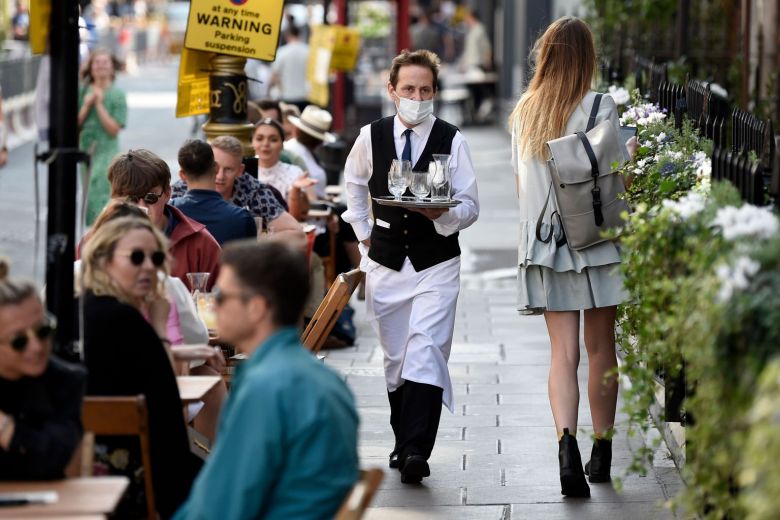 A waiter serves customers at tables outside a restaurant in London's Soho on Sept 20, 2020.