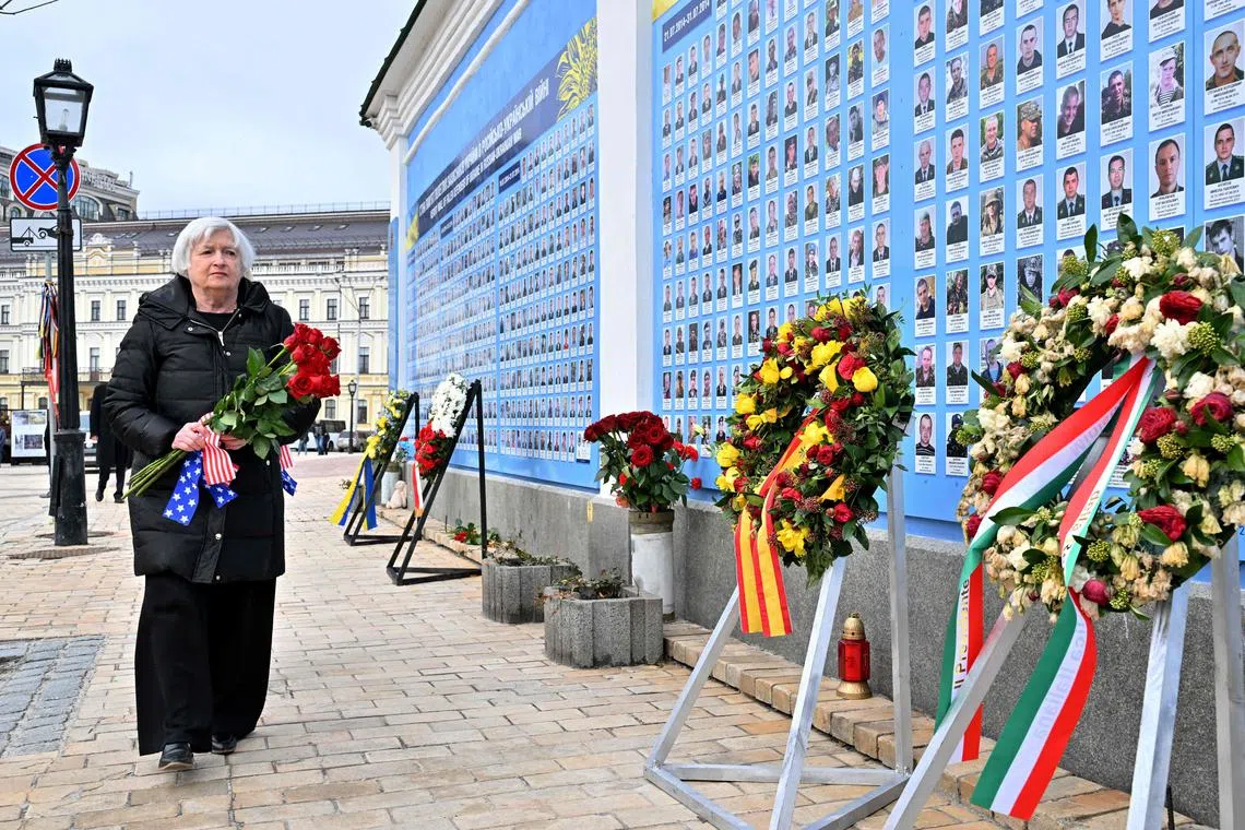US Secretary of the Treasury Janet Yellen paying her respects at a Memory Wall of Fallen Defenders of Ukraine during her visit to Kyiv on Feb 27, 2023