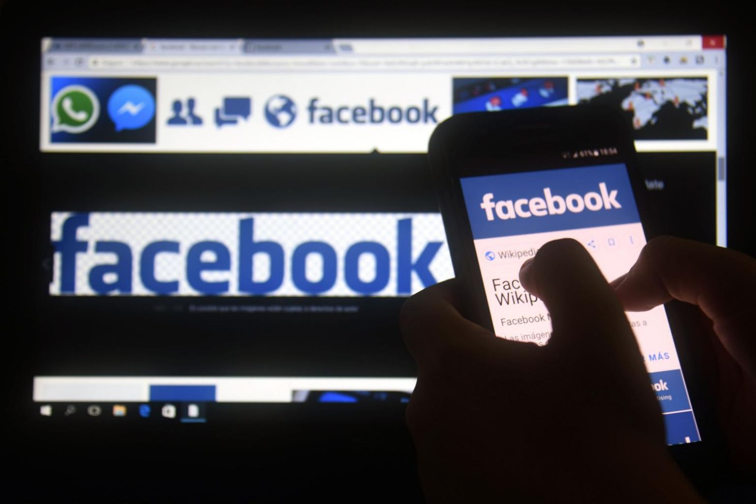 A cellphone and a computer screen displaying the logo of the social networking site Facebook in a photo taken on March 22, 2018.