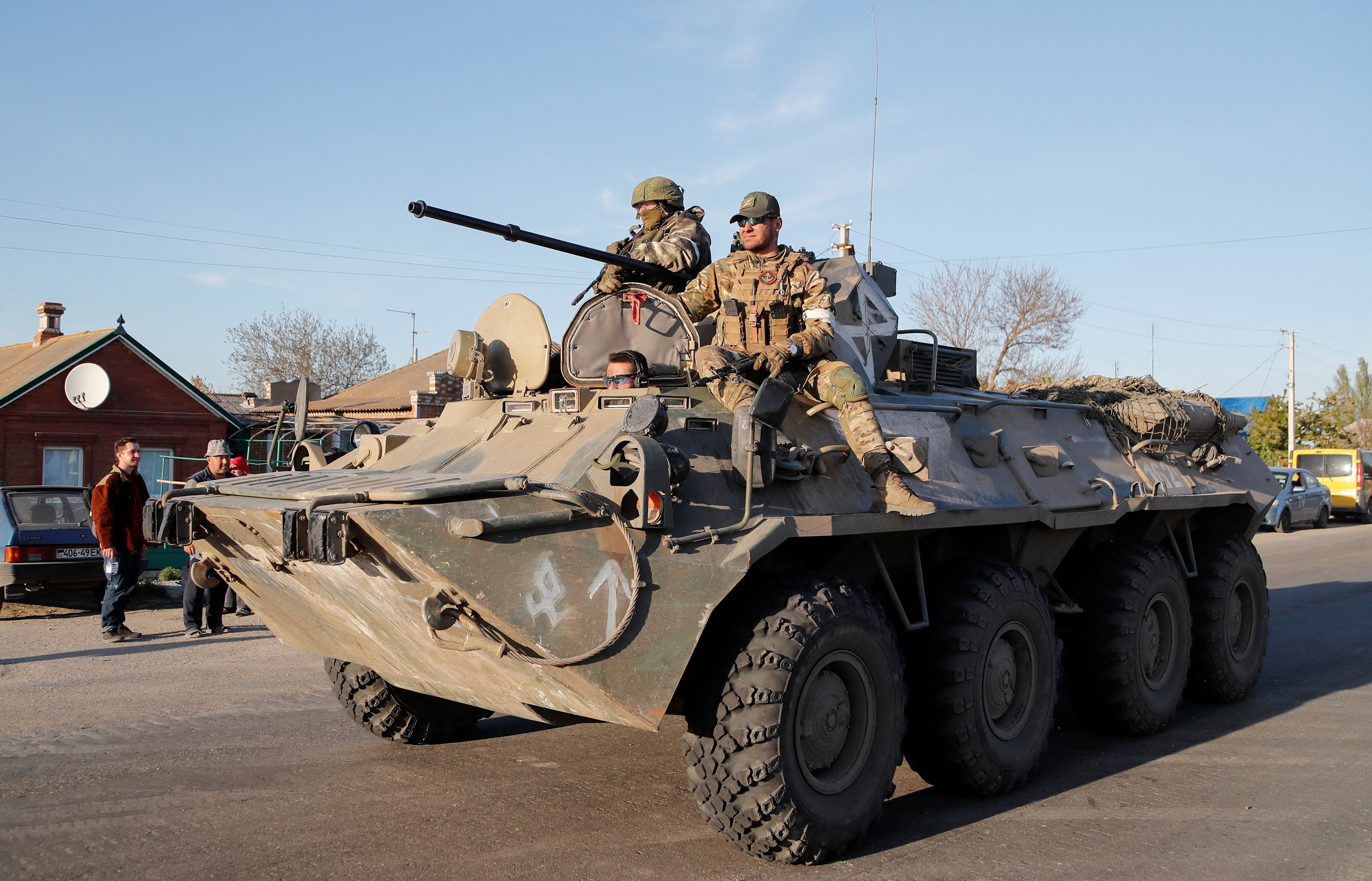 A May 2022 photo shows pro-Russian troops on top of an armoured personnel carrier in the Donetsk region of Ukraine.
