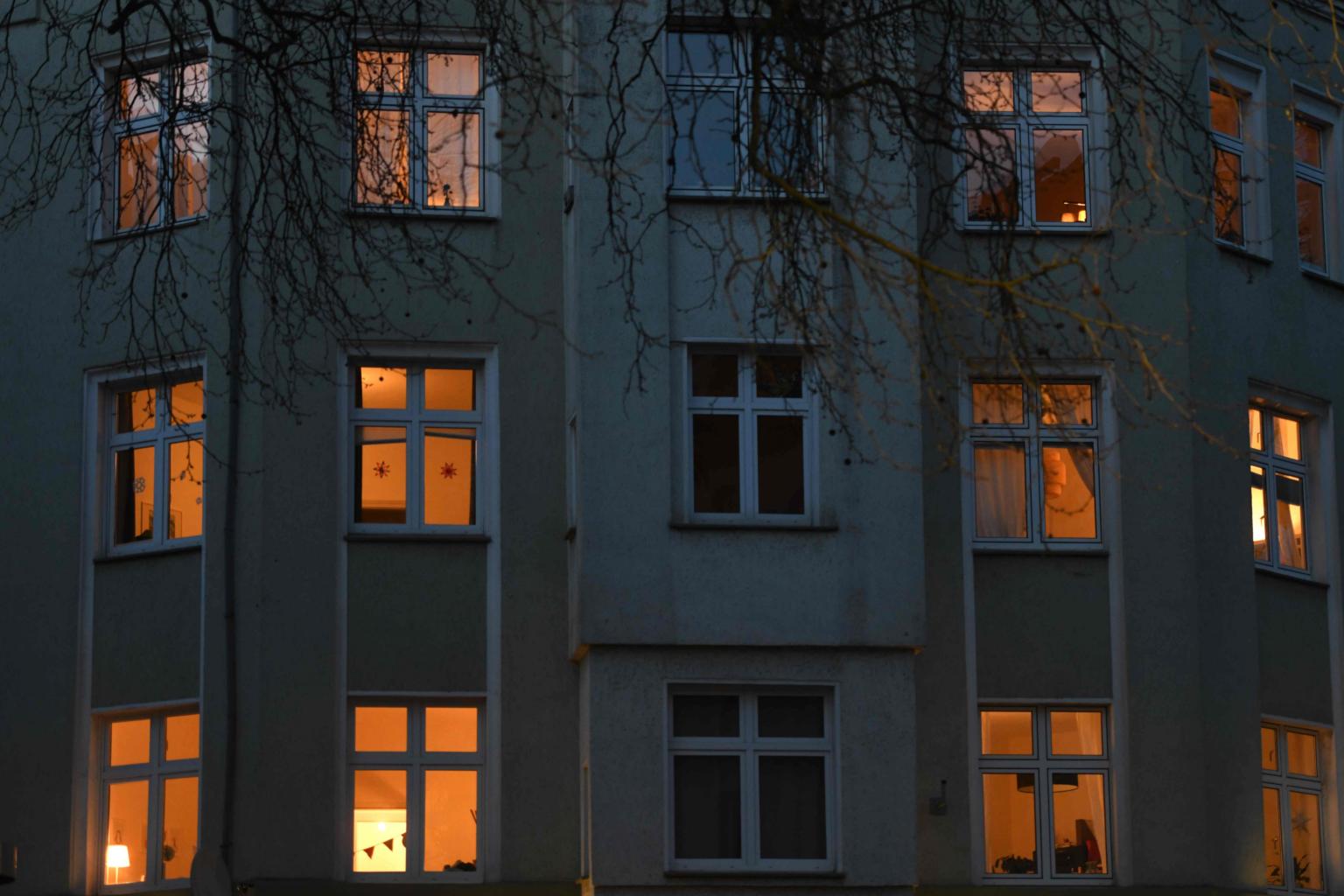 A picture taken on March 22, 2020, shows the facade of a building with illuminated flats in Dortmund, western Germany.