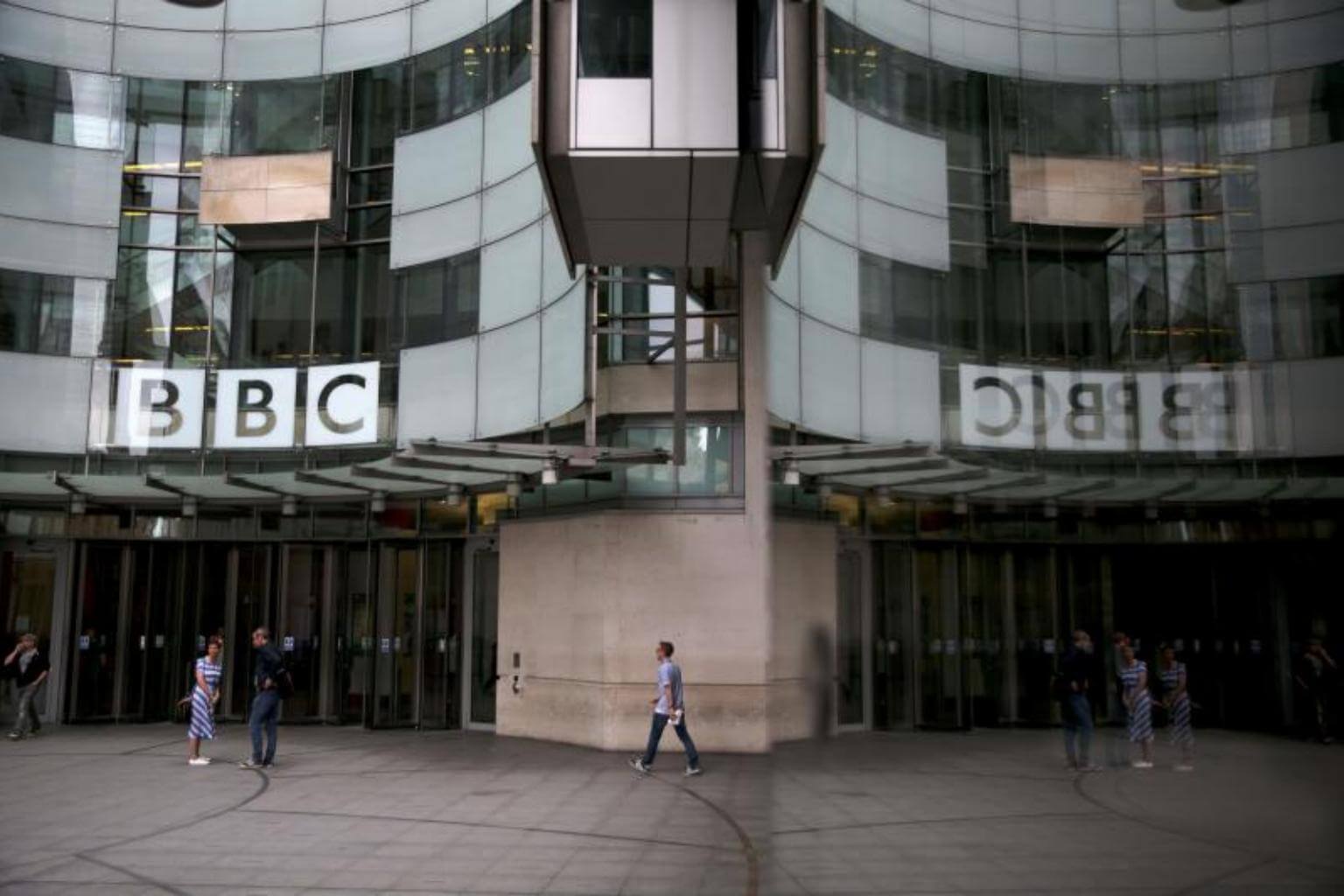 Staff and visitors walk outside the headquarters of the British Broadcasting Corporation (BBC) in central London on July 19, 2017.