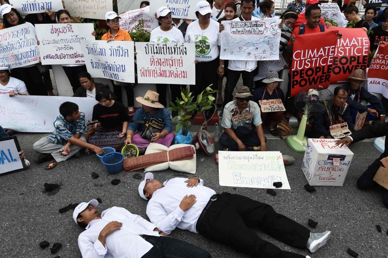 Environmental activists and supporters take part in a demonstration in front of the United Nations building in Bangkok, where climate talks are taking place, on Sept 8, 2018.