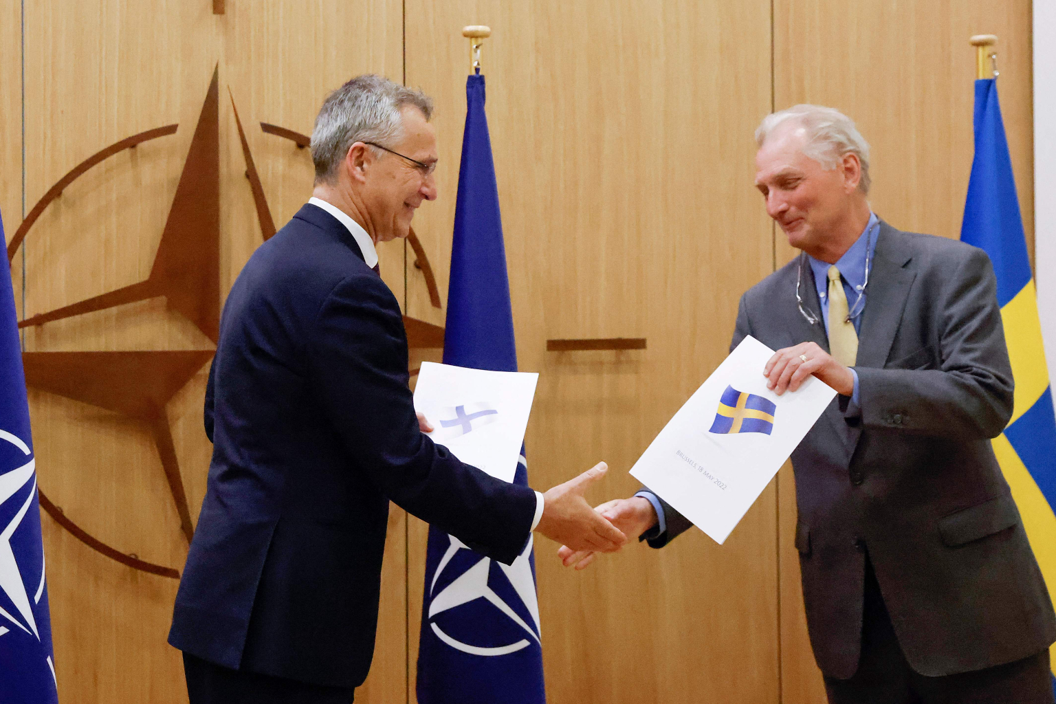 Nato Secretary-General Jens Stoltenberg (left) receiving the application letter from Swedish ambassador to Nato Axel Wernhoff.