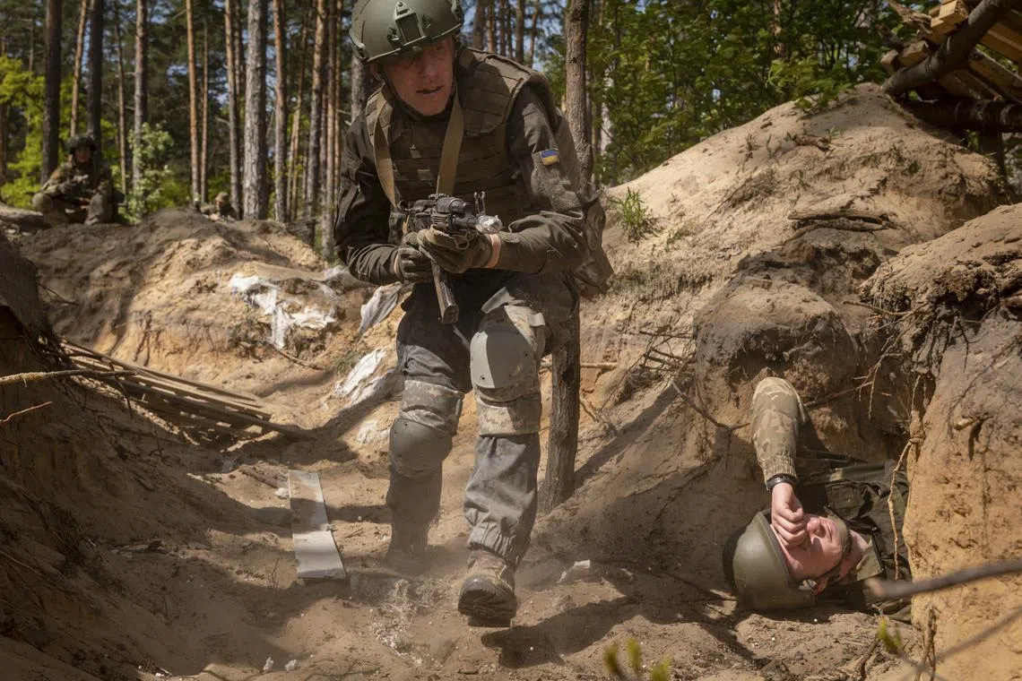 Ukrainian soldiers simulating an attack on a trench system during training exercises outside Kyiv.