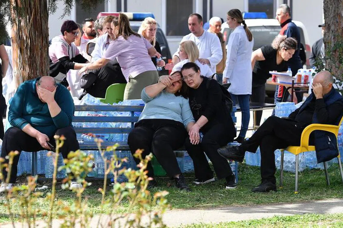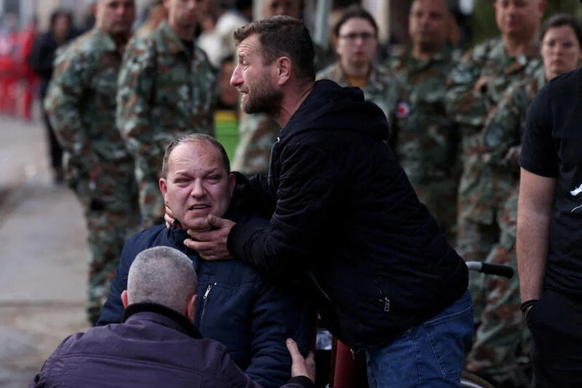 Relatives of the victims of an overnight fire in a crowded nightclub in North Macedonia, wait for news of their loved ones at the Kocani General Hospital in Kocani.