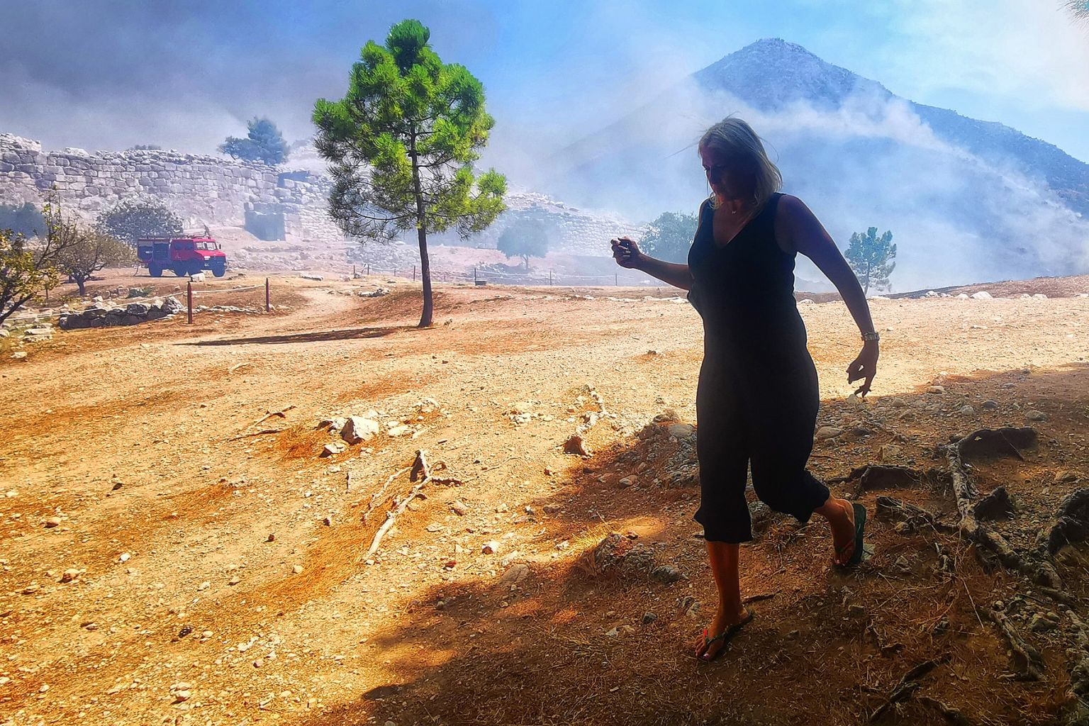 A woman leaves the archaeological site of Mycenae after a fire broke out on Aug 30, 2020.