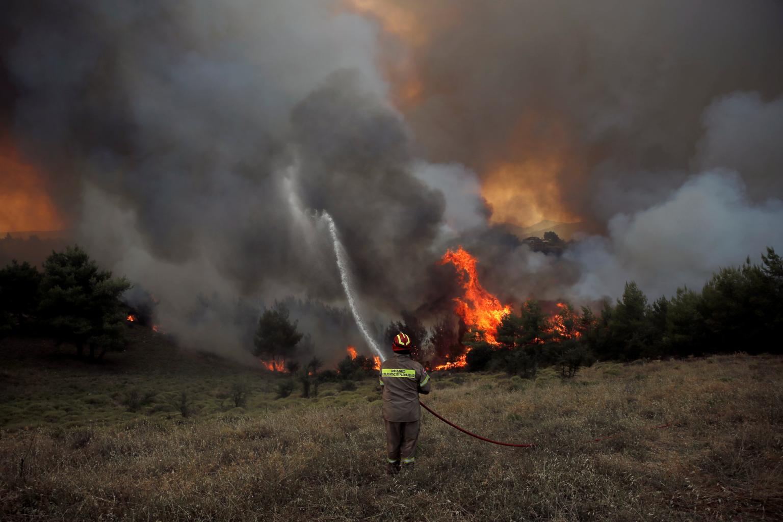 ATHENS/LISBON (REUTERS, AFP) - Firefighters battled to contain a wildfire near Athens on Monday (Aug 14) after it spread overnight to three towns some 45 km north-east of the capital and damaged dozens of homes.