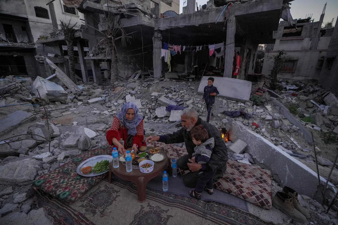 A Palestinian family in Gaza preparing to break fast on the first day of Ramadan on March 11 amid the ruins of their house.