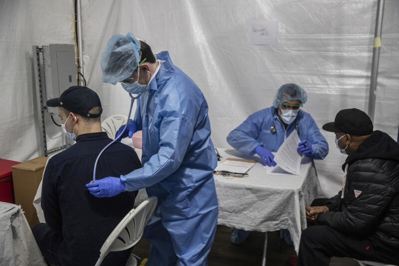 Health care workers screen patients for the coronavirus at Brooklyn Hospital Center in New York, US, on March 23, 2020.