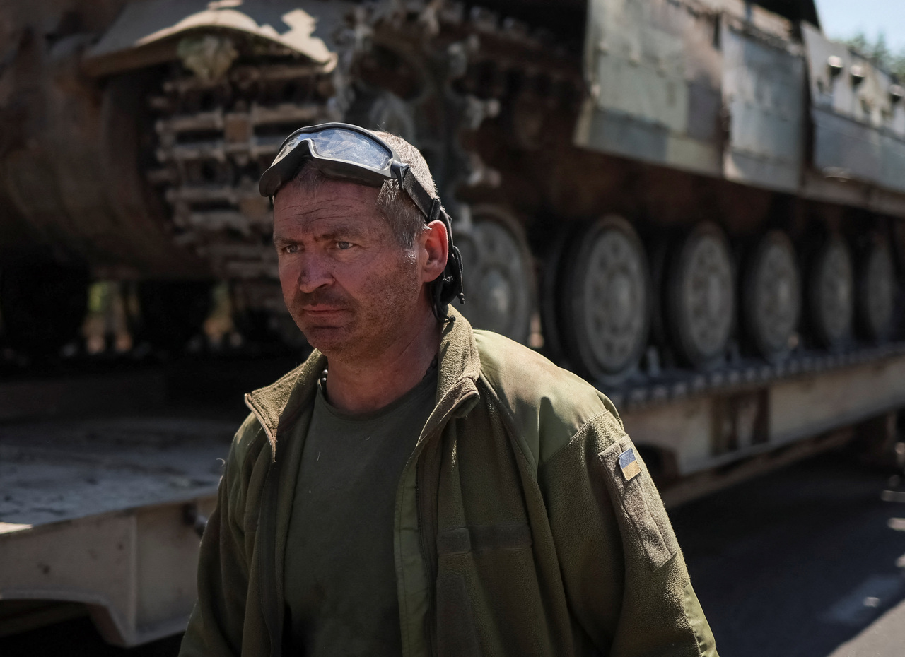A Ukrainian serviceman walks near a military truck with a tank in the Donbas region of Ukraine, on July 17, 2022.