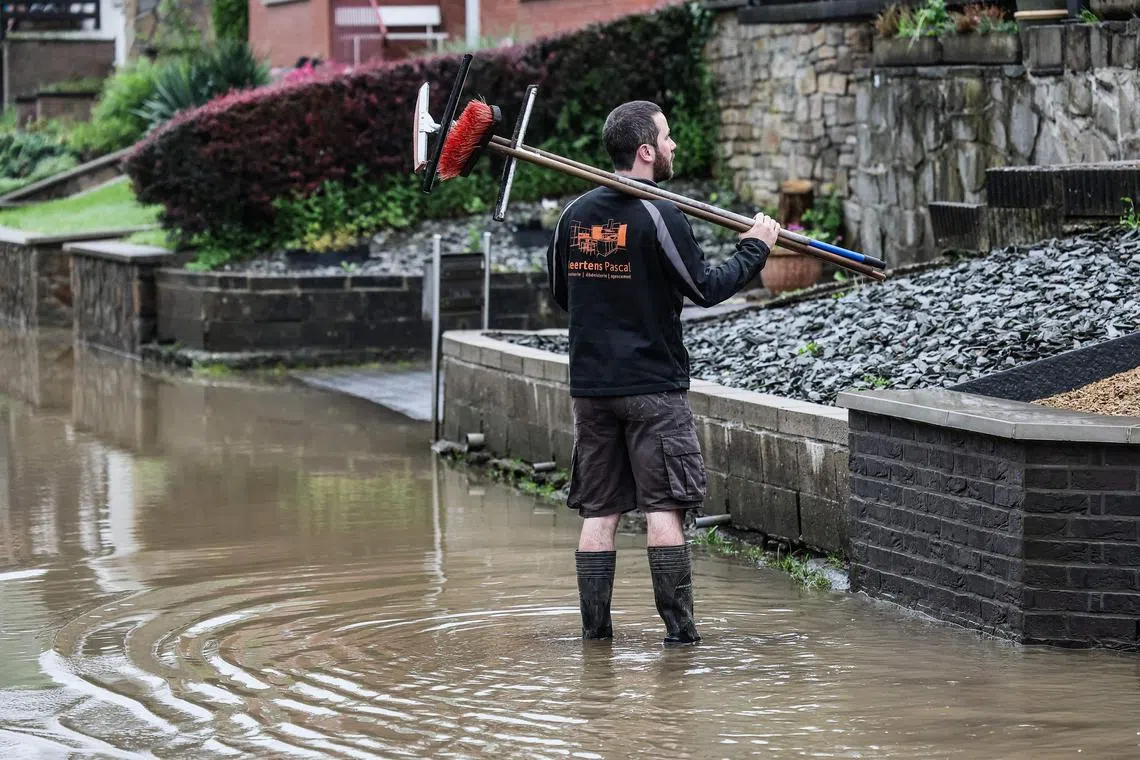 A resident in a flooded street the day after an episode of heavy rain in Trooz on May 18, 2024.