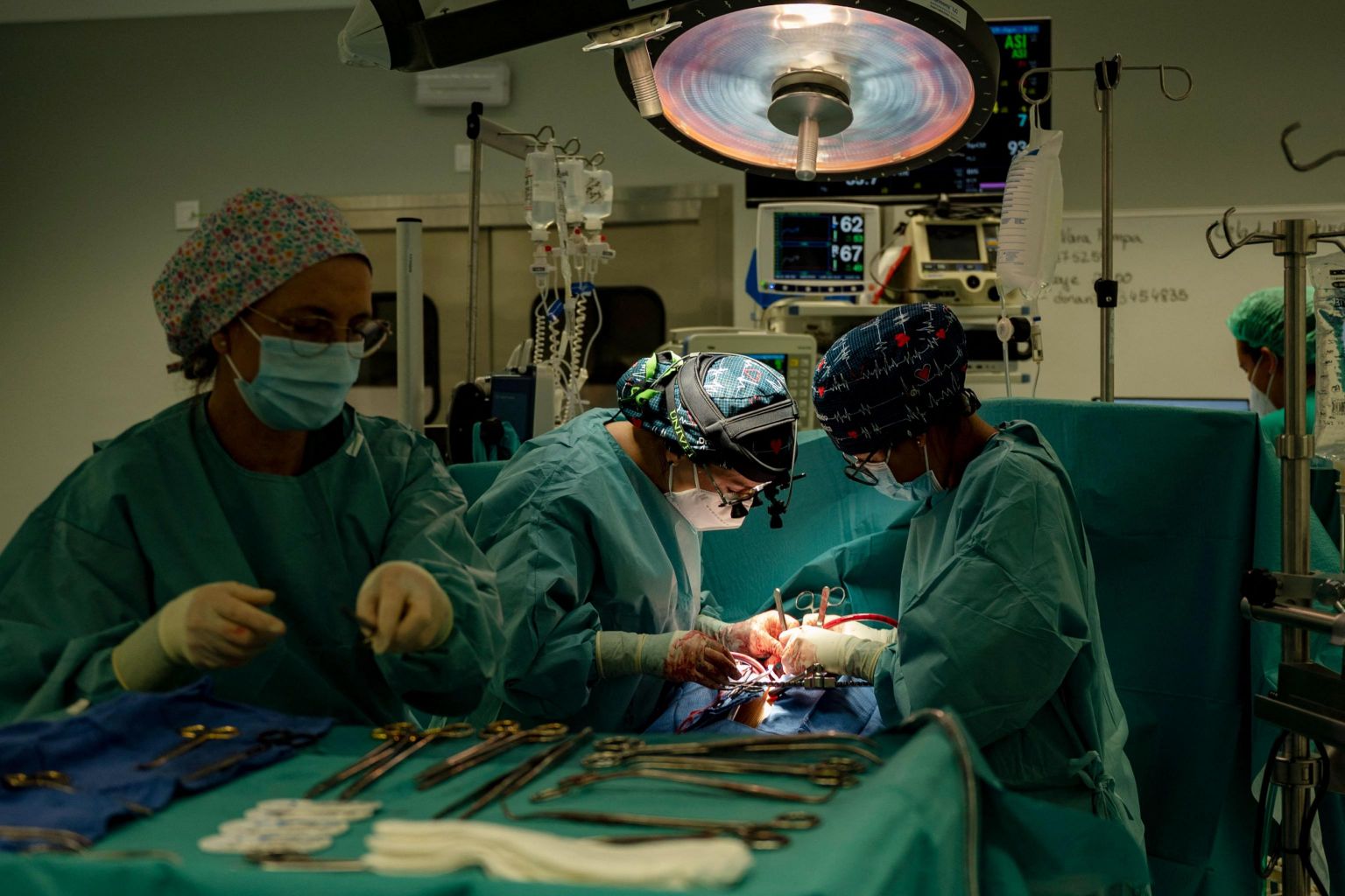 Approaching the donor, whose rib cage is open, Dr Esteban de Villarreal delicately palpates the still-beating heart. After several minutes, he steps back and goes to make a phone call.