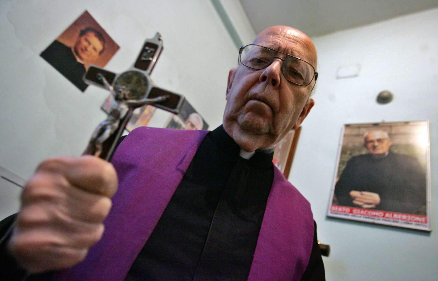 Former exorcists Don Gabriele Amorth, president of honour of the Association of Exorcists, poses in Rome in 2005.