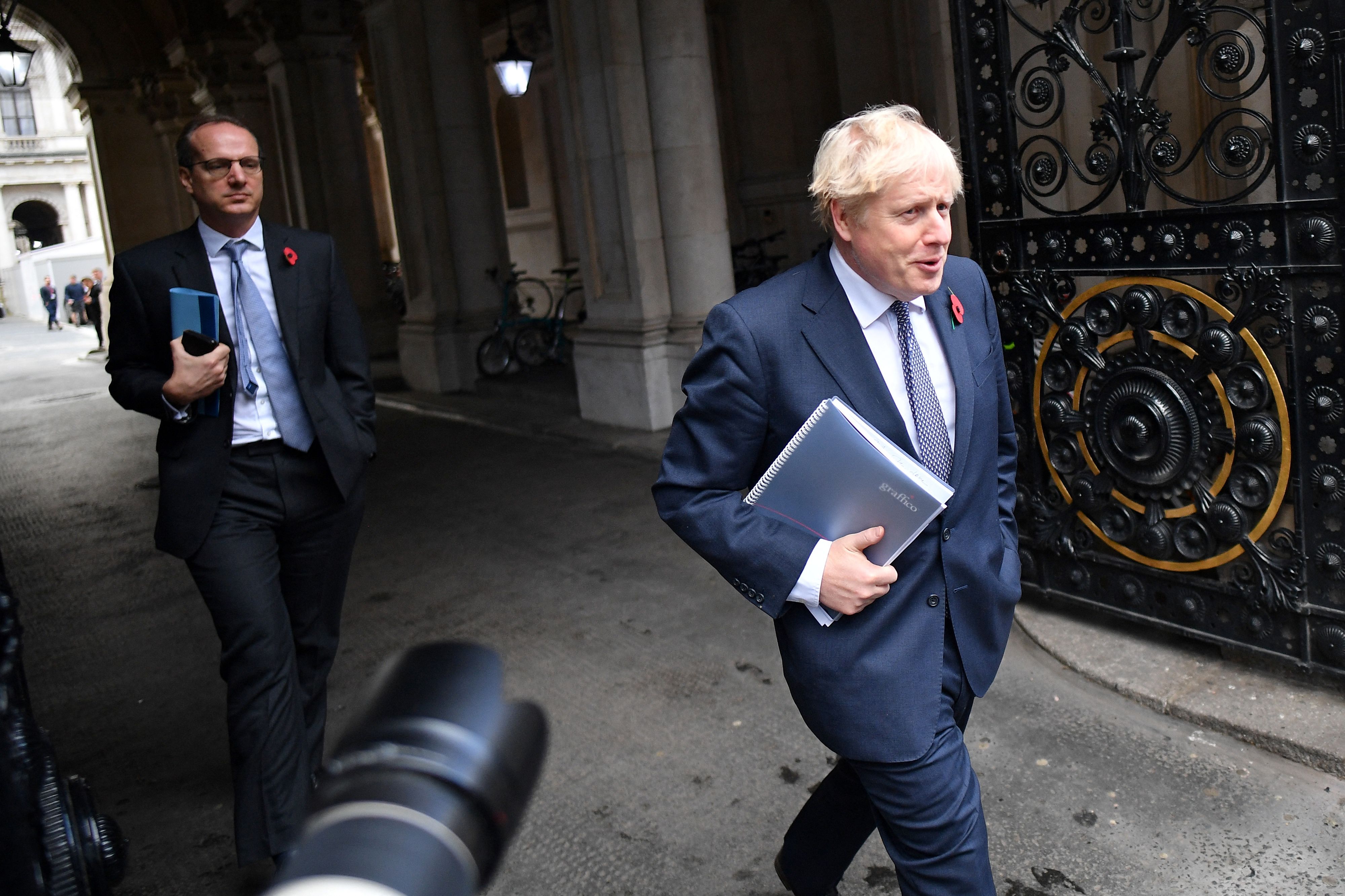 A 2020 photo shows Boris Johnson (right) arriving back at Downing Street with principal private secretary Martin Reynolds.