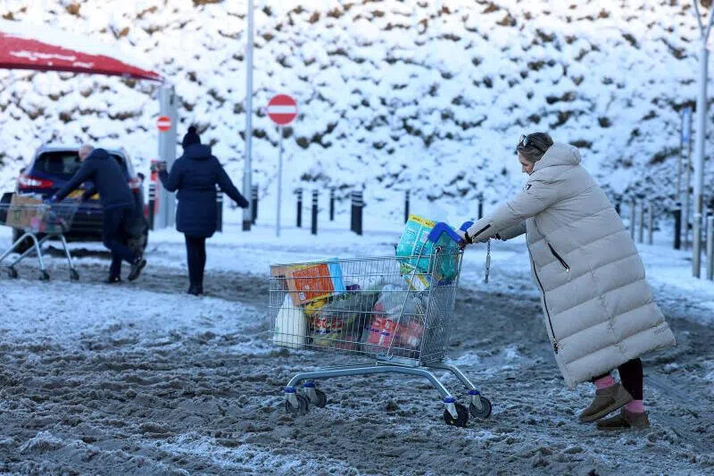 A woman pushes a shopping trolley in the snow as cold and ice weather warnings are extended by Britain’s Met Office, in Ballymena, Northern Ireland, on Jan 5, 2026.