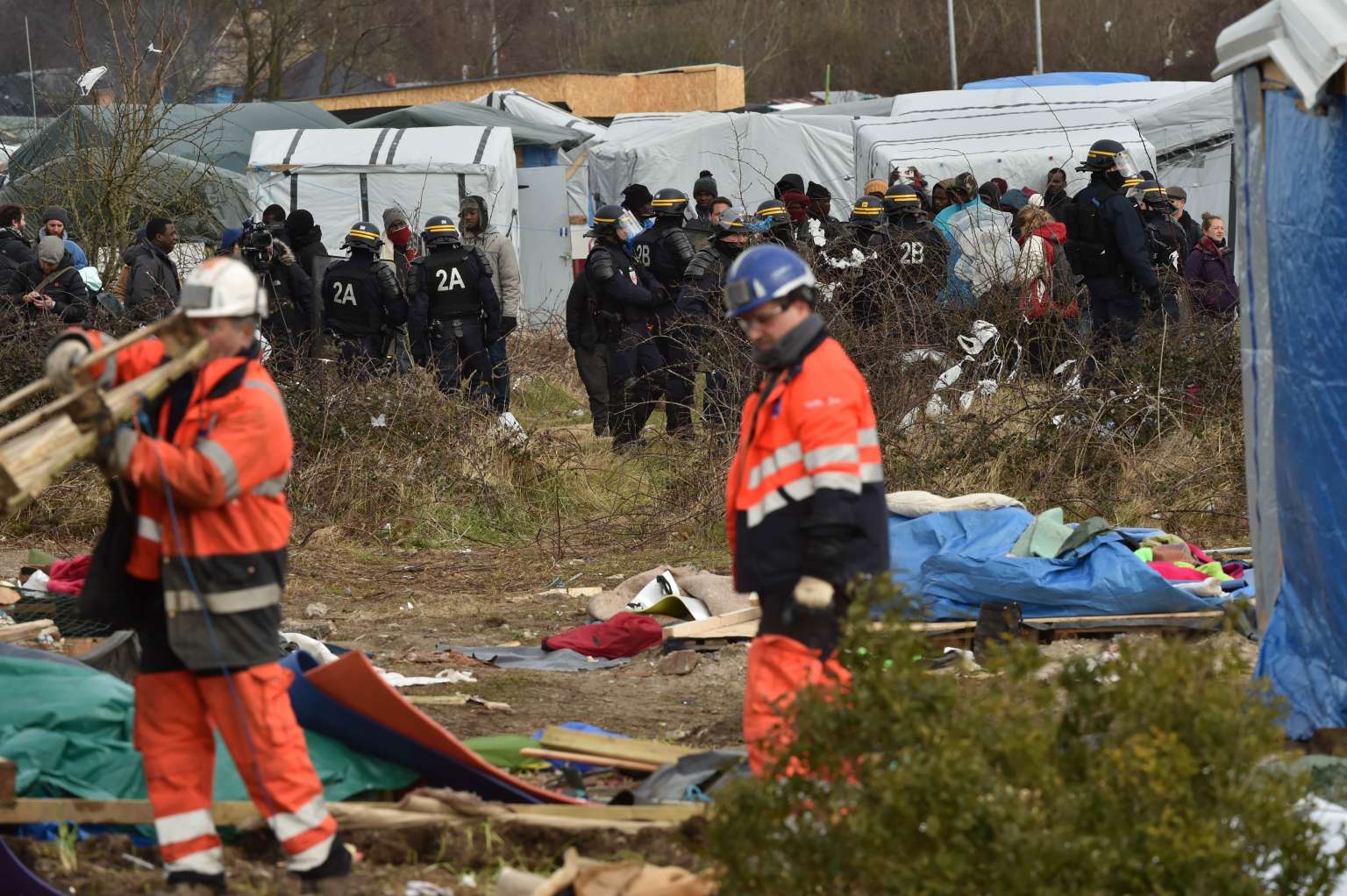 Agents dismantle a shelter as anti-riot policemen stand nearby on Feb 29, 2016 in the "jungle" migrants and refugees camp in Calais.