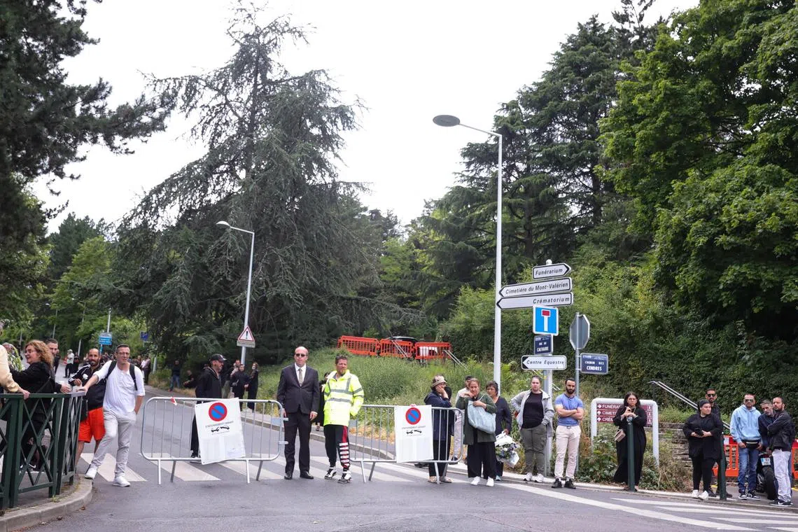 People wait near the entrance to Mont Valerien cemetery, ahead of a funeral there for Nahel M, in Nanterre, near Paris.