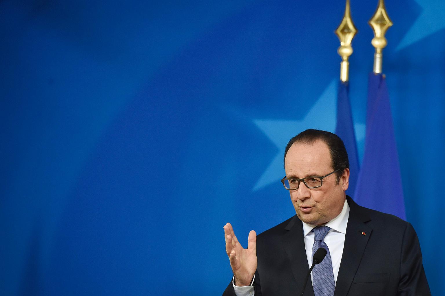 French President Francois Hollande holding a press conference during an EU leaders summit in Brussels on March 7, 2016.