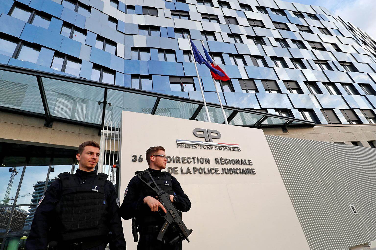 French policemen stand in front of the entrance of the new headquarters of the Direction Regionale de Police Judiciaire de Paris (DRPJ Paris), the criminal investigation division of the Police nationale.