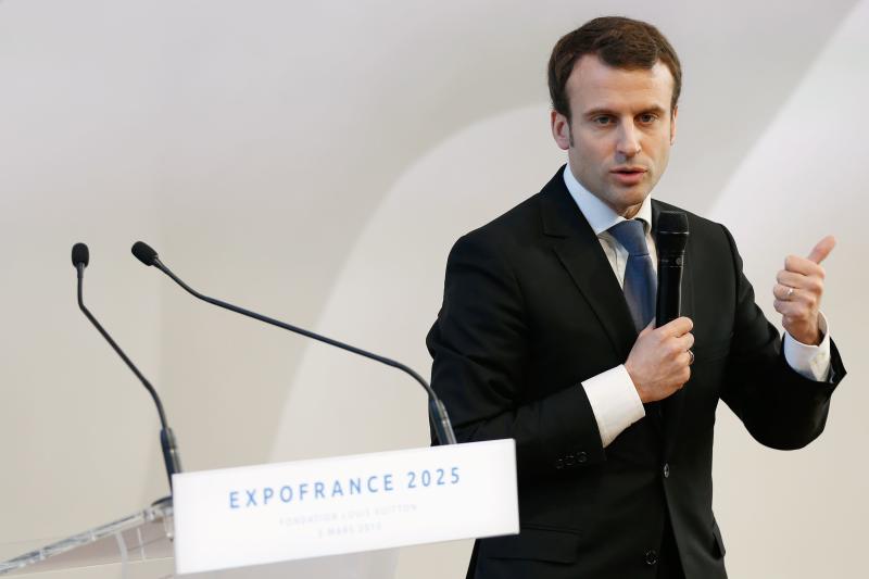 French Economy Minister Emmanuel Macron speaking during the presentation of the economic project within France's bid to host the 2025 World Expo, at the Louis Vuitton Arts Foundation in Paris on March 05, 2015.