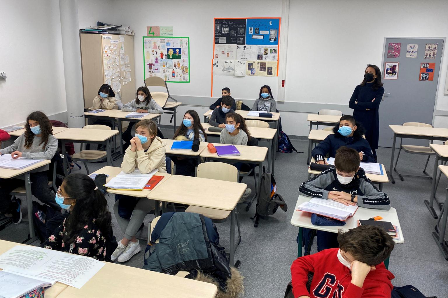 Schoolchildren in a classroom at the College Jean Renoir Middle School in Paris on Jan 7, 2022.