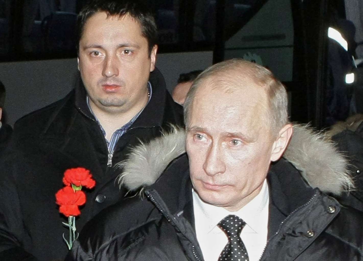 A 2010 photo shows then Russian prime minister Vladimir Putin (right) walking with Alexander Shprygin to lay flowers at the grave of a slain Spartak Moscow fan.