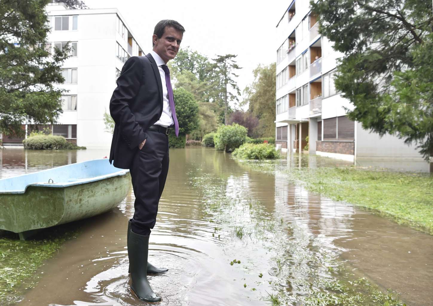 French Prime Minister Manuel Valls wearing boots visits flooded areas in Crosne on June 4, 2016 in a southern Paris' suburb.
