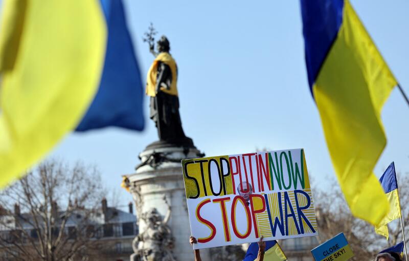 Protesters hold a placard at Place de la Republique during a rally in support of Ukraine, on March 19, 2022.