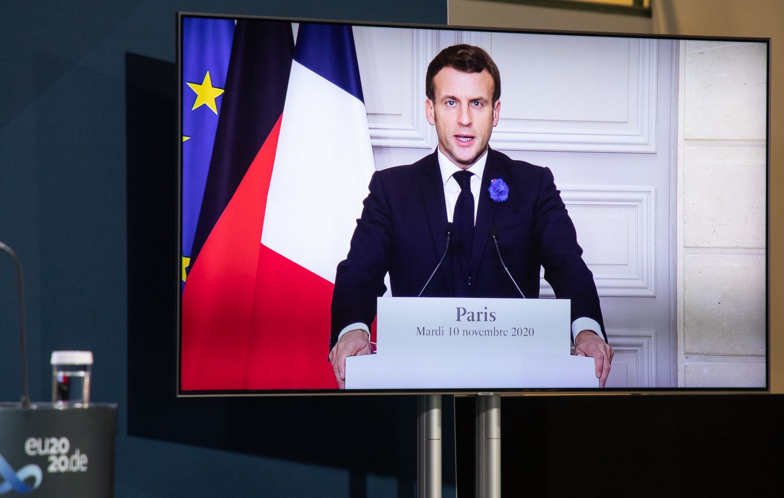 French President Emmanuel Macron delivers a press statement on European security in Berlin, Germany, Nov 10, 2020.