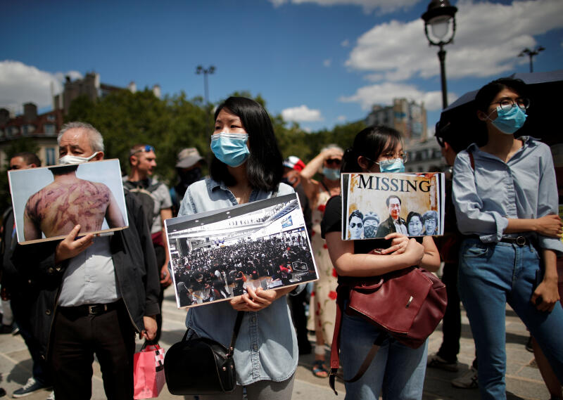 People wearing masks hold pictures as they demonstrate in support of Hong Kong protesters in Paris, on July 11, 2020.